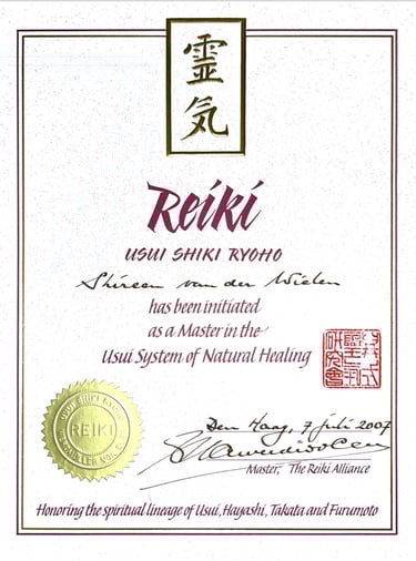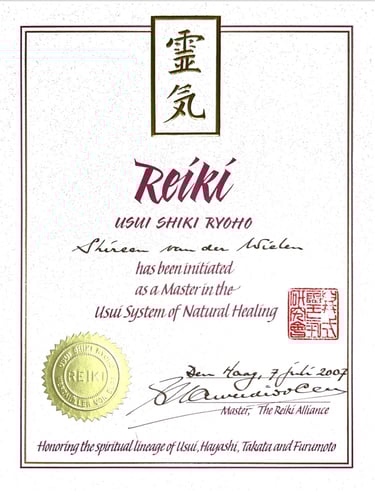 Mijn lineage als Reikimaster, vanuit de oorsprong te noemen Mikao Usui, Chujiro Hayashi, Phyllis Lee Furomoto, Ariane Groeneveld, Guus Werdmuller von Egg, Shireen van der Wielen (als zevende in Lijn).