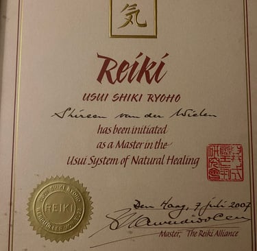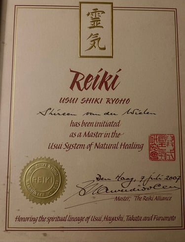 Mijn lineage als Reikimaster, vanuit de oorsprong te noemen Mikao Usui, Chujiro Hayashi, Phyllis Lee Furomoto, Ariane Groeneveld, Guus Werdmuller von Egg, Shireen van der Wielen (als zevende in Lijn).