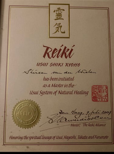 Mijn lineage als Reikimaster, vanuit de oorsprong te noemen Mikao Usui, Chujiro Hayashi, Phyllis Lee Furomoto, Ariane Groeneveld, Guus Werdmuller von Egg, Shireen van der Wielen (als zevende in Lijn).